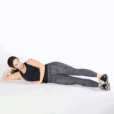 侧压腿就是以前体育课上的动作,要领也类似,膝盖不要过脚尖,脚后跟不要抬起来,被压的那条腿要伸直,感受内侧肌肉被拉伸的感觉。侧卧抬腿的动作示范如下。也可以将上面那条腿垂直弯曲放到前面,抬后腿,这样的动作难度更大一些。